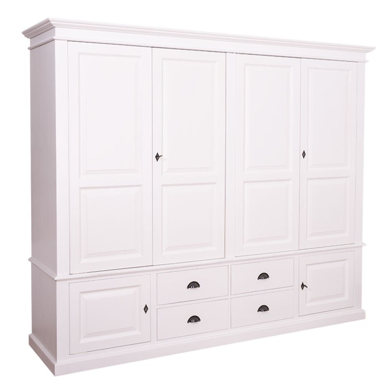 Het product biedt royale opbergruimte achter vier grote massieve deuren aan de bovenkant, vier laden en twee kleine deuren gemonteerd aan de onderkant van de kast. Achter de deuren is het interieur verdeeld in twee gelijke delen, aan de linkerkant bevindt zich de hangstang en respectievelijk aan de rechterkant zijn 3 vaste planken geplaatst. Dit product, gemaakt van 100% massief hout, komt volledig gemonteerd en biedt veel presentatieruimte.